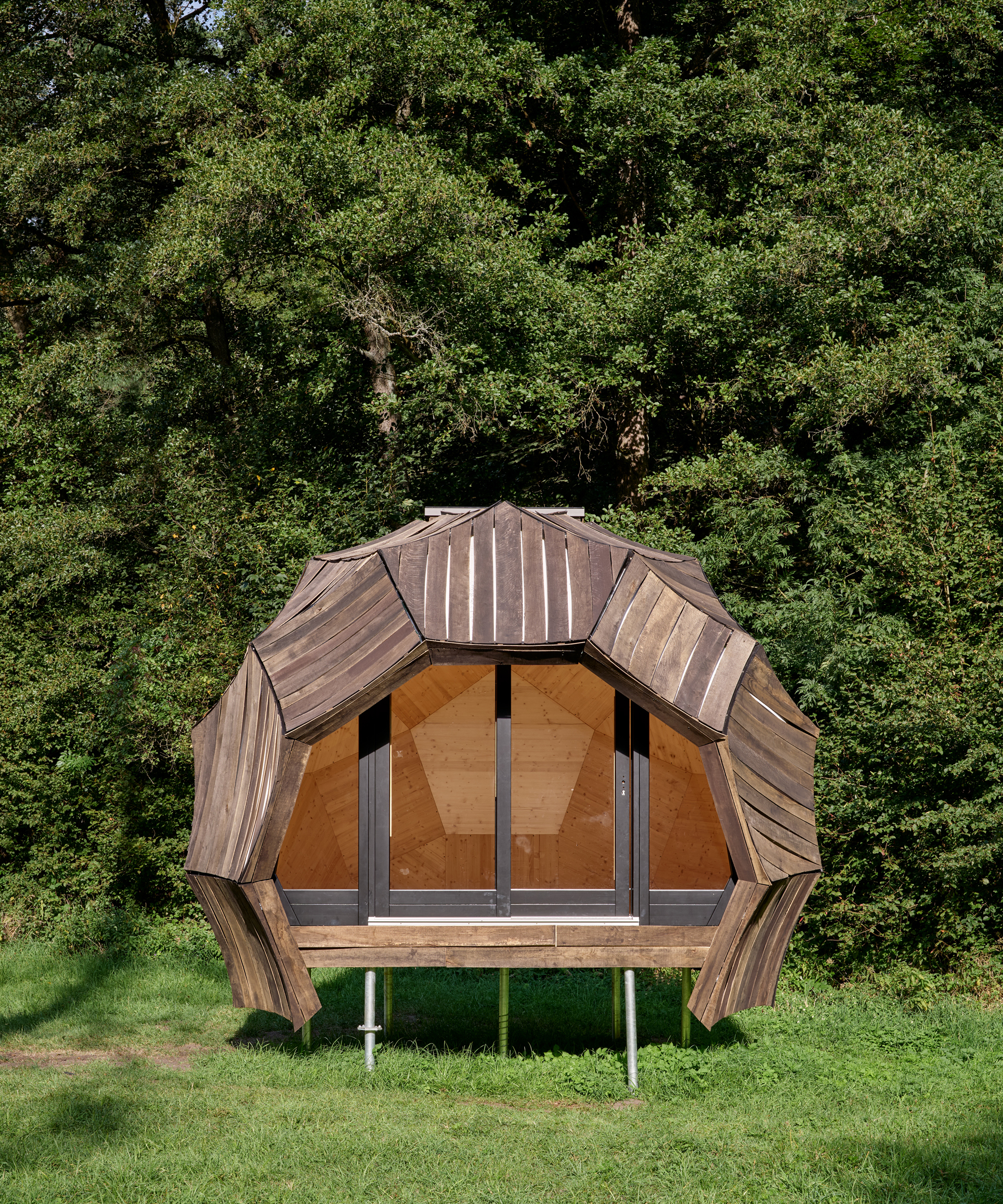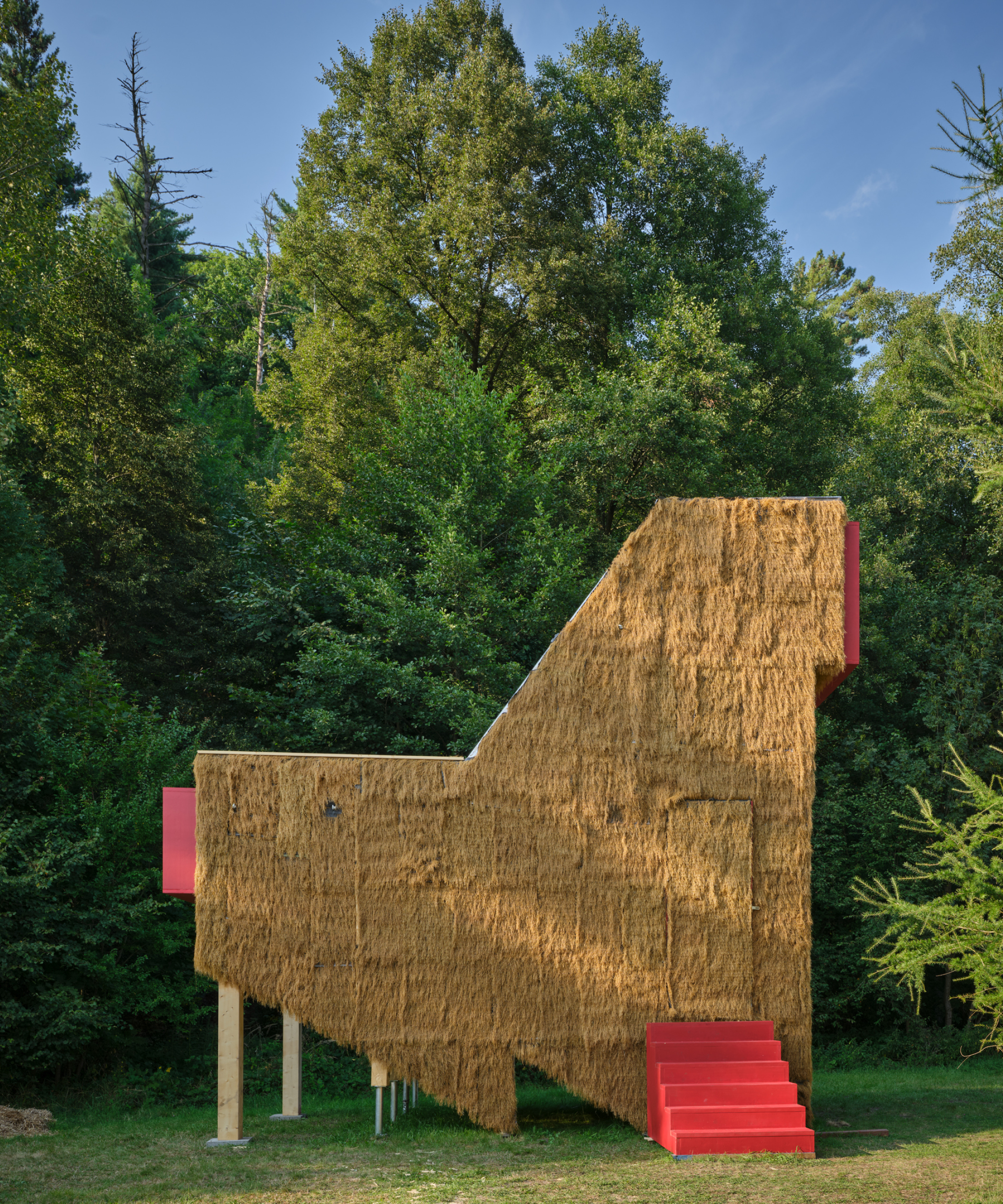 The Chicken cabin has a wooden structure covered with designer artificial straw, its interior is cozy and bright (~26m2). It has its own bathroom and kitchen, and thanks to the panorama you can enjoy from the bed, you can feel in perfect harmony with the forest environment.