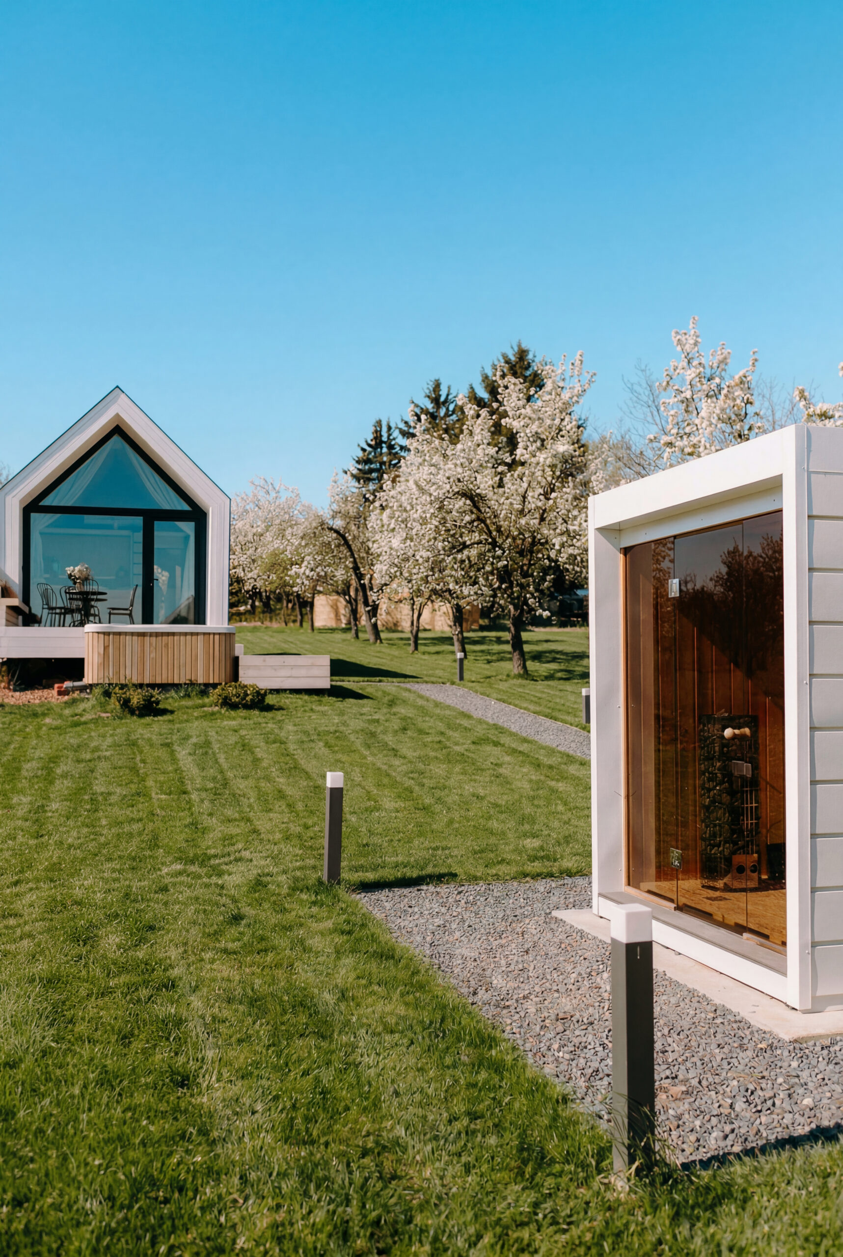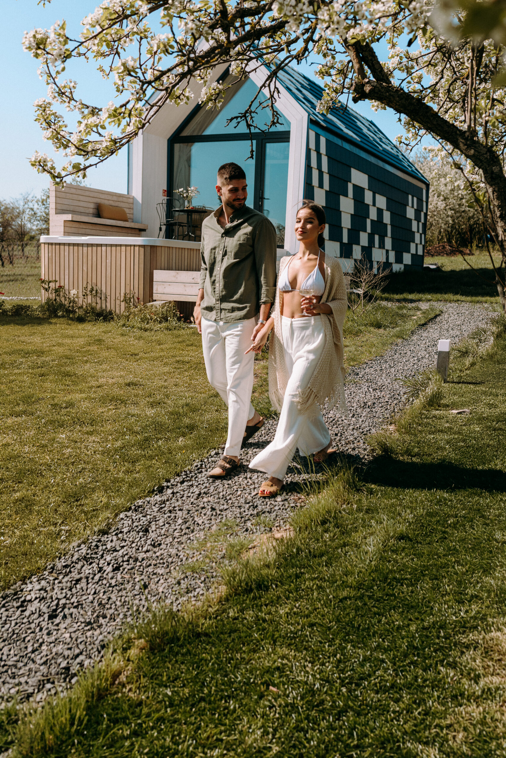The specialty of our design cabins is that their wooden structure is covered with blue-white painted concrete tiles. Both cabins await their guests with a private jacuzzi, a shared Finnish sauna cabin, an equipped interior and an electric fireplace.