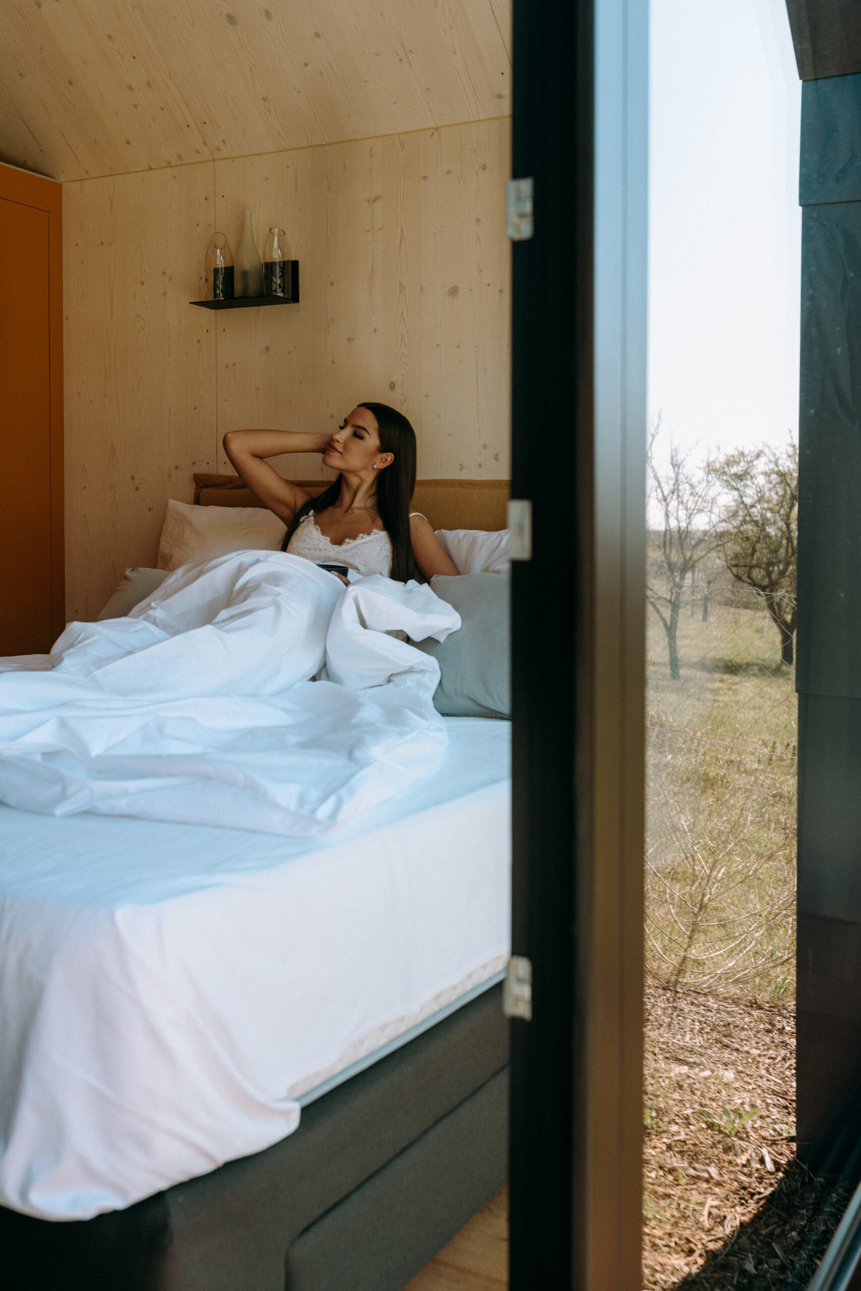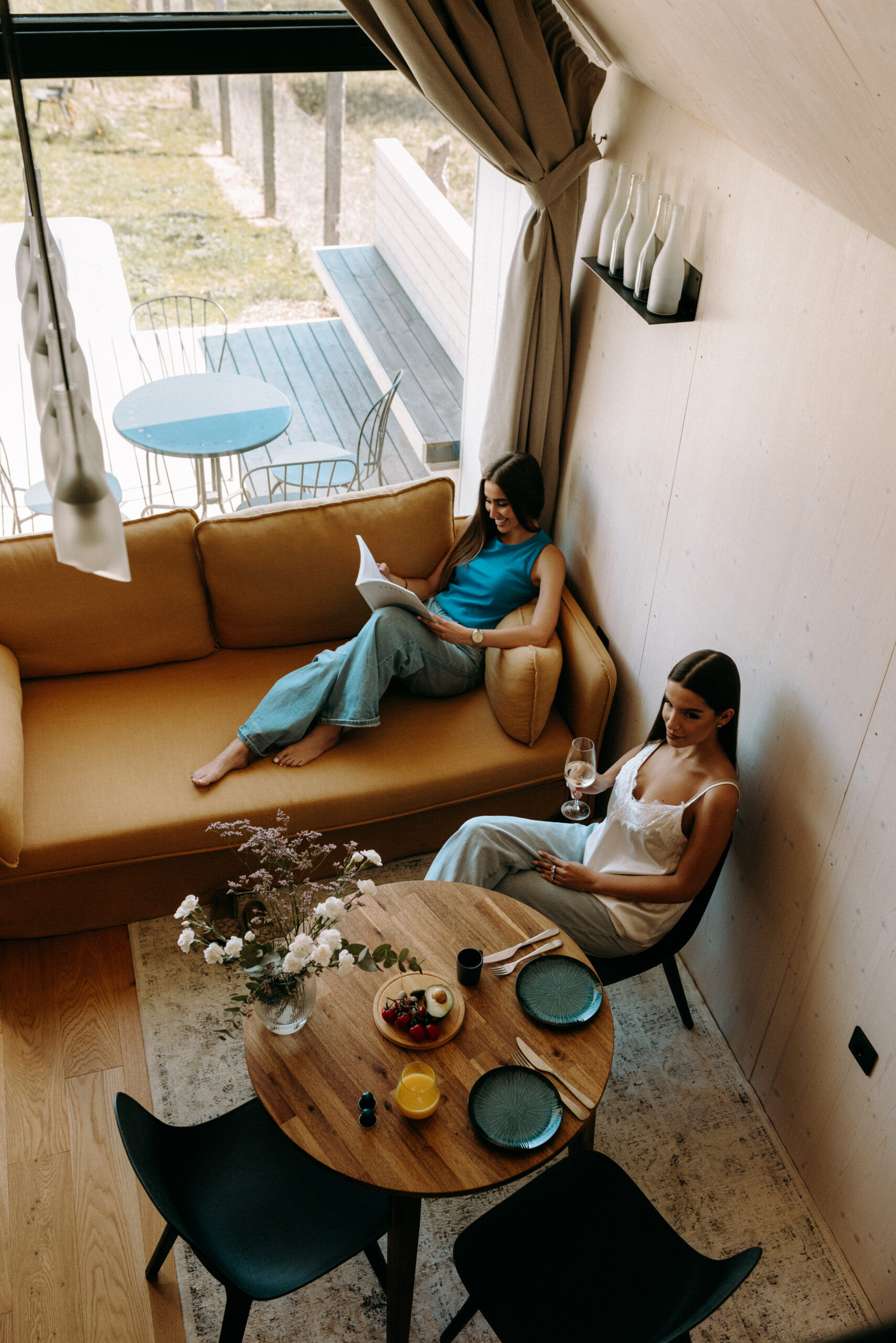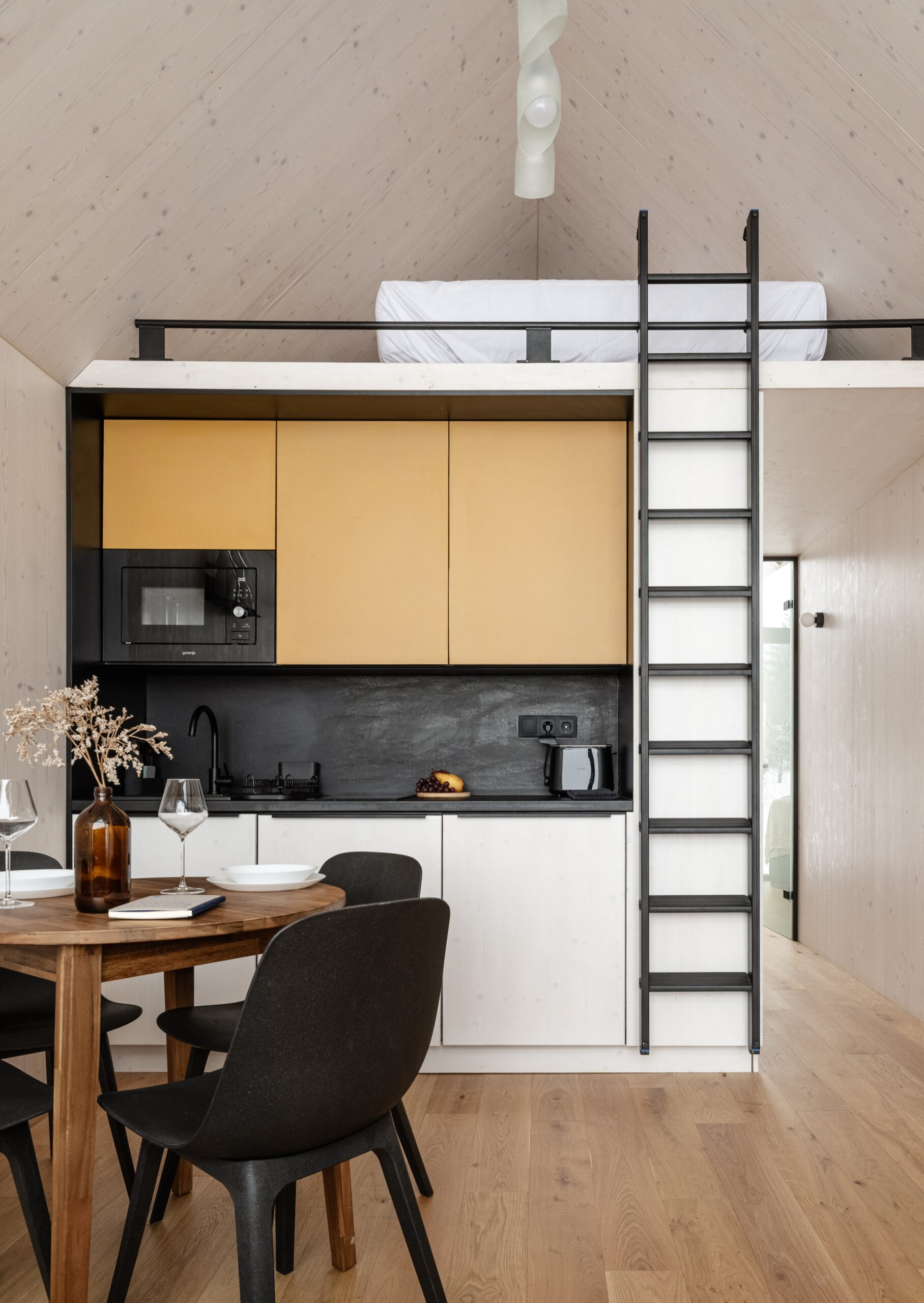 In our Etyekikék Deluxe cabin, there is a well-equipped kitchenette and bathroom in addition to the panoramic living room with terrace access. The bedroom is located on the exciting gallery accessible by ladder. You can enter the jacuzzi from the two-story terrace.