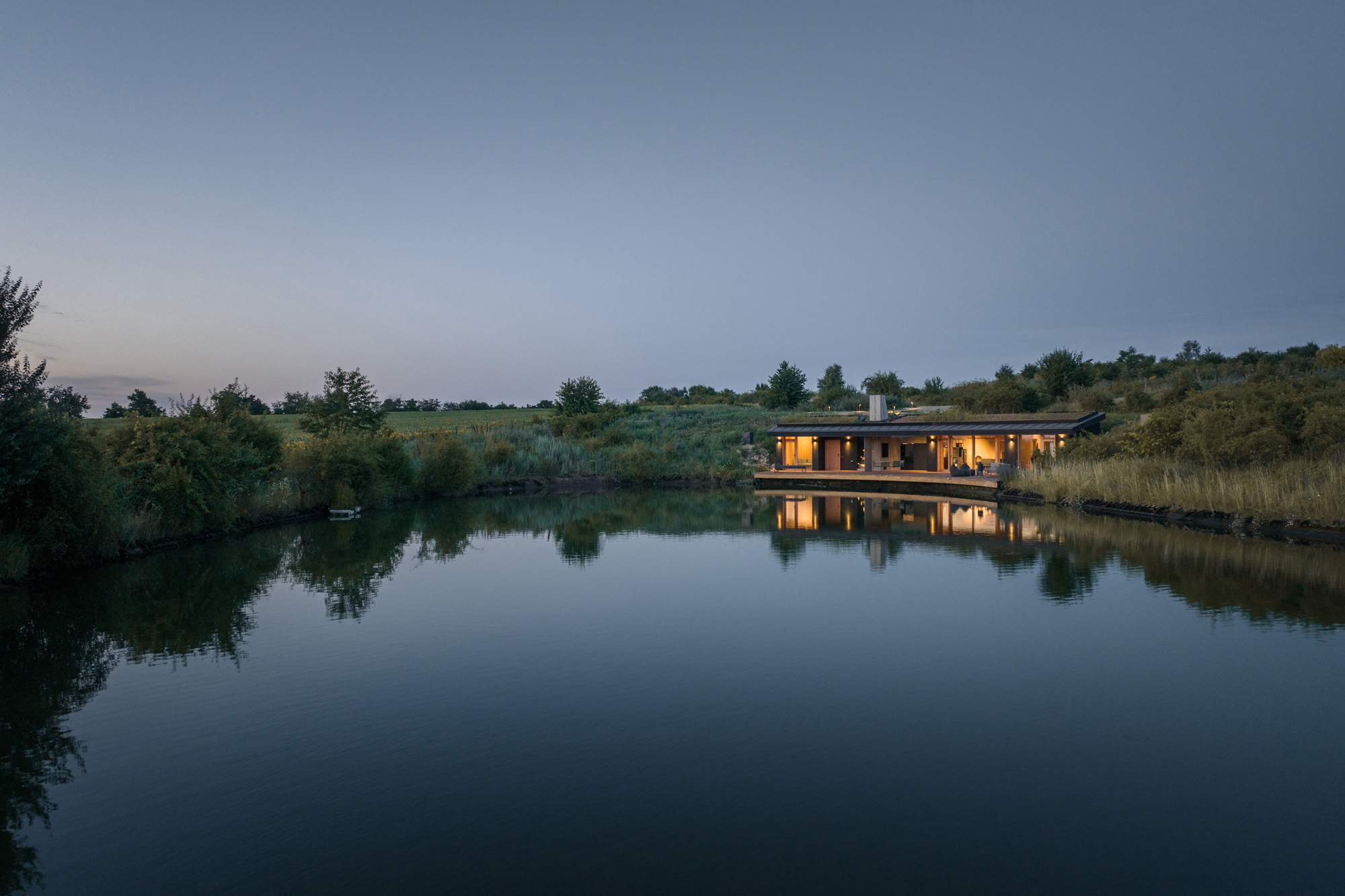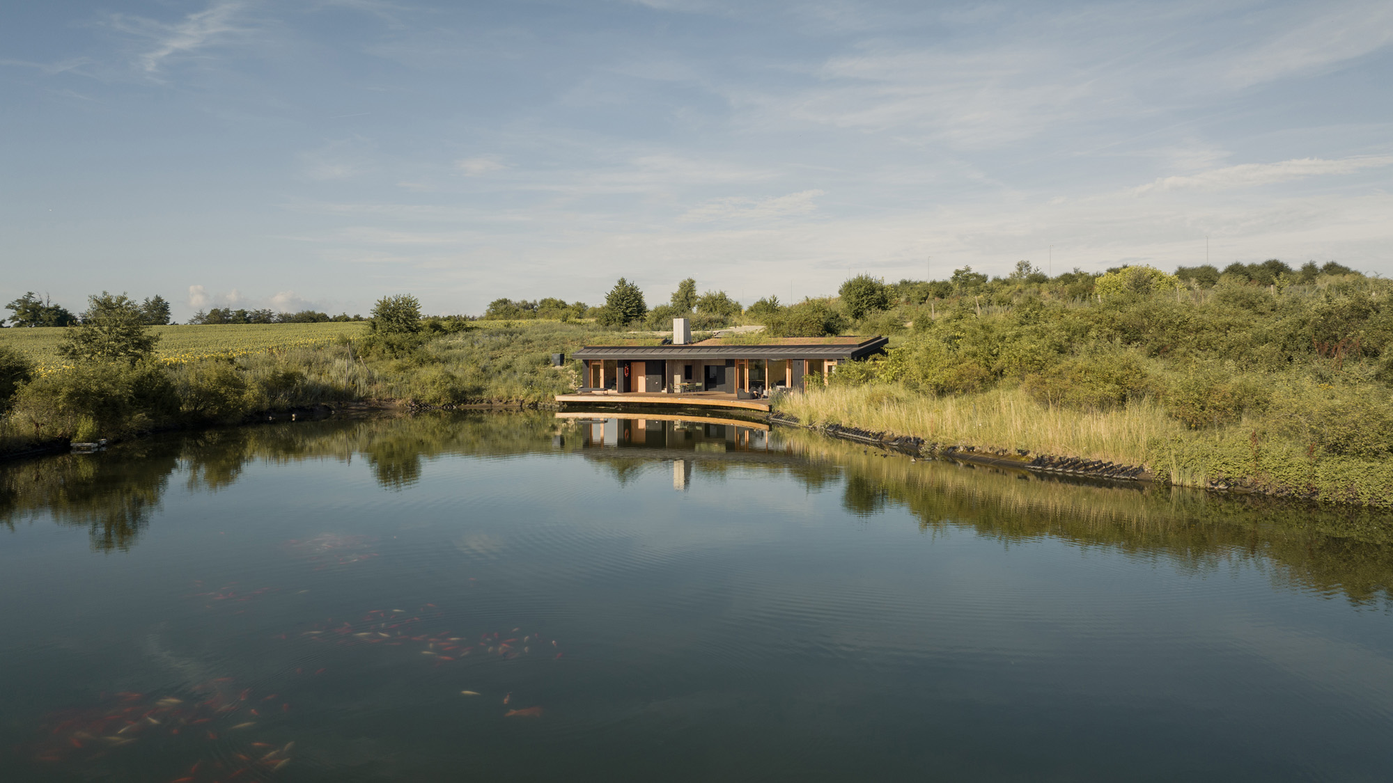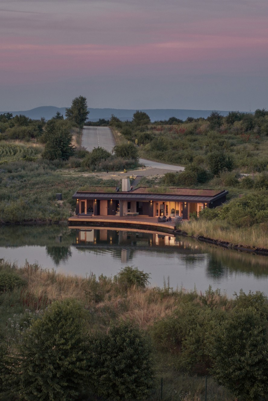 A hidden house embedded in the contour of the fish pond, as if created by nature itself. This concealment is conscious in several ways: it shows respect for the natural environment and provides a private sphere for the users of the house. Both the house and the natural environment offer a fascinating retreat experience, not only for slowing down, but with the promise of living the moment fully and intensely.