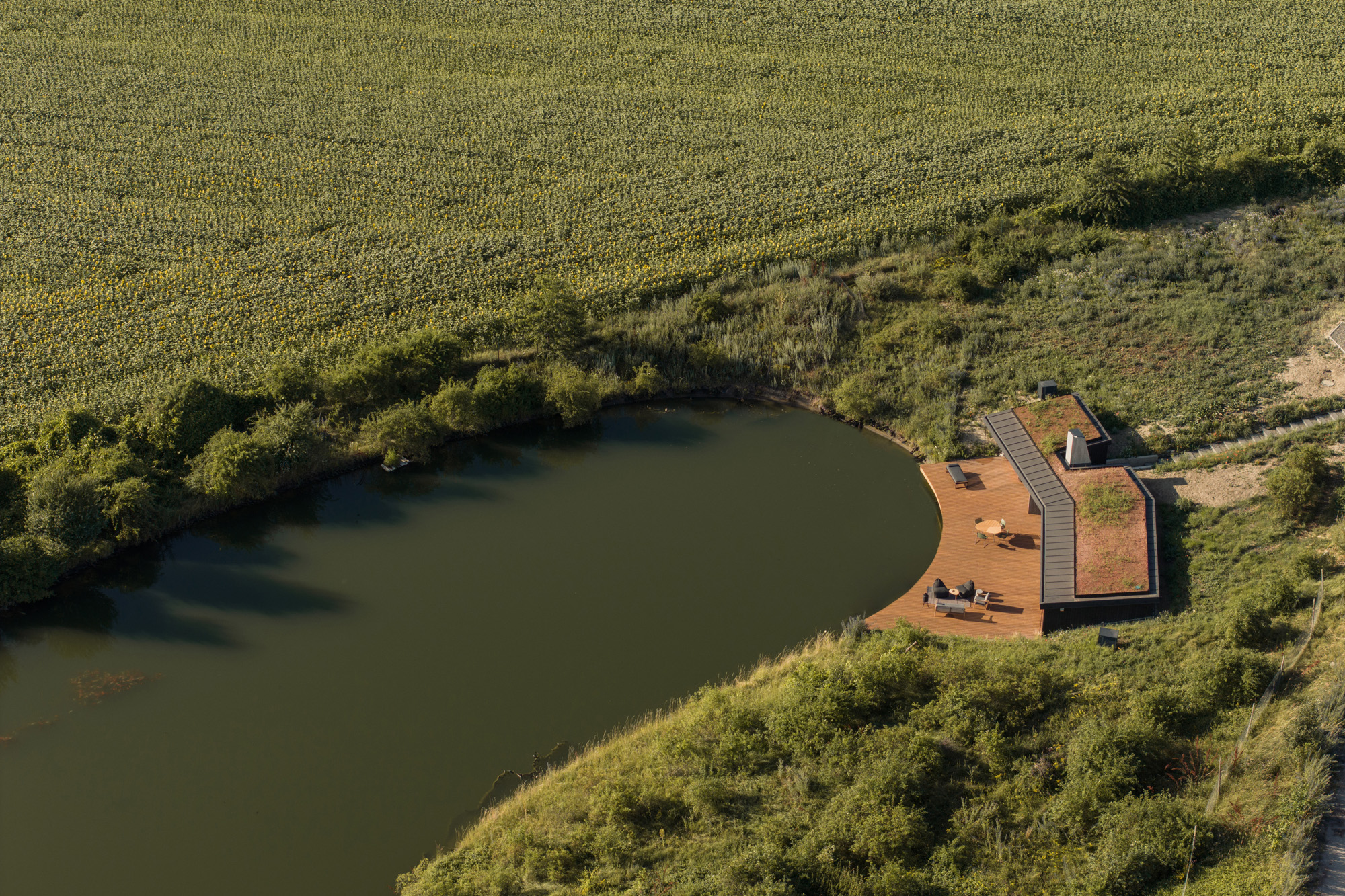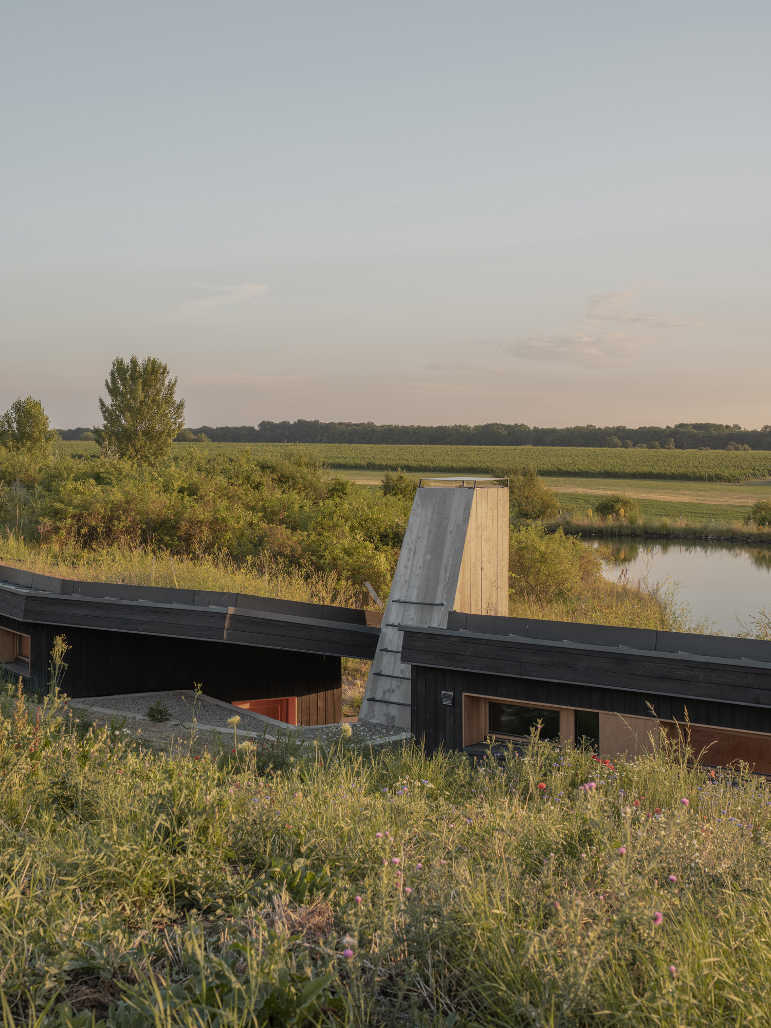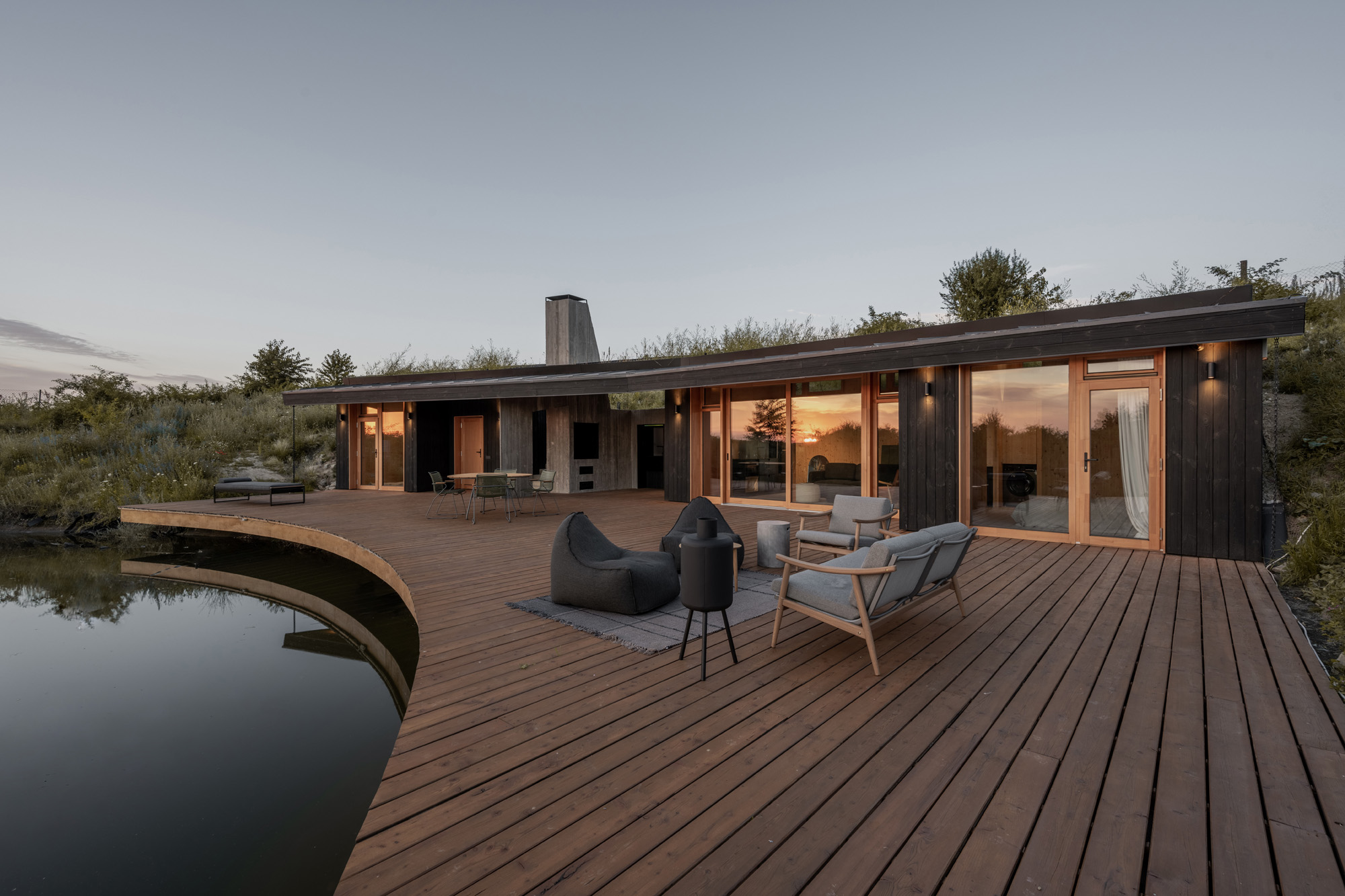 A hidden house embedded in the contour of the fish pond, as if created by nature itself. This concealment is conscious in several ways: it shows respect for the natural environment and provides a private sphere for the users of the house. Both the house and the natural environment offer a fascinating retreat experience, not only for slowing down, but with the promise of living the moment fully and intensely.